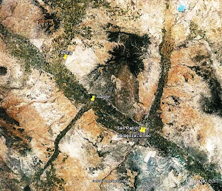 Acompaño también esta imagen, tomada de Google Earth, para que puedan hacerse idea de su situación, allá por el siglo XI. Ya conocen el paisaje: el valle del Ebro, un gran desierto surcado por unos oasis lineales a lo largo de los ríos que lo atraviesan (como ahora). Saraqusta, la capital, situada en la encrucijada que forman los ríos Ebro, Gállego y Huerva, con el gran alminar de la mezquita-aljama (situada donde ahora está la catedral de la Seo) y el otro alminar octogonal –la actual torre de San Pablo-. Aguas arriba del Ebro, a una jornada de camino (cuatro leguas) y en la encrucijada con el río Jalón, se encuentra Alagón. Y otra jornada más arriba -siempre hacia el noroeste- y cerca del río Arba, Tauste.